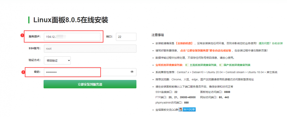 在這里我們輸入服務器的公網IP和系統密碼,點擊立即安裝到服務器。