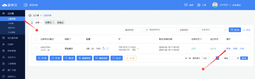 2、購買完成后,進入藍米云控制臺-云計算-云服務器,找到你的服務器,點擊右側的管理