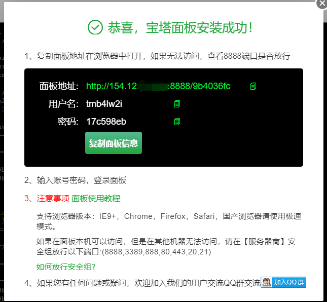 4、等待安裝完成后,會顯示面板地址、用戶名、密碼,請務必保存好,后續管理服務器需要用到。