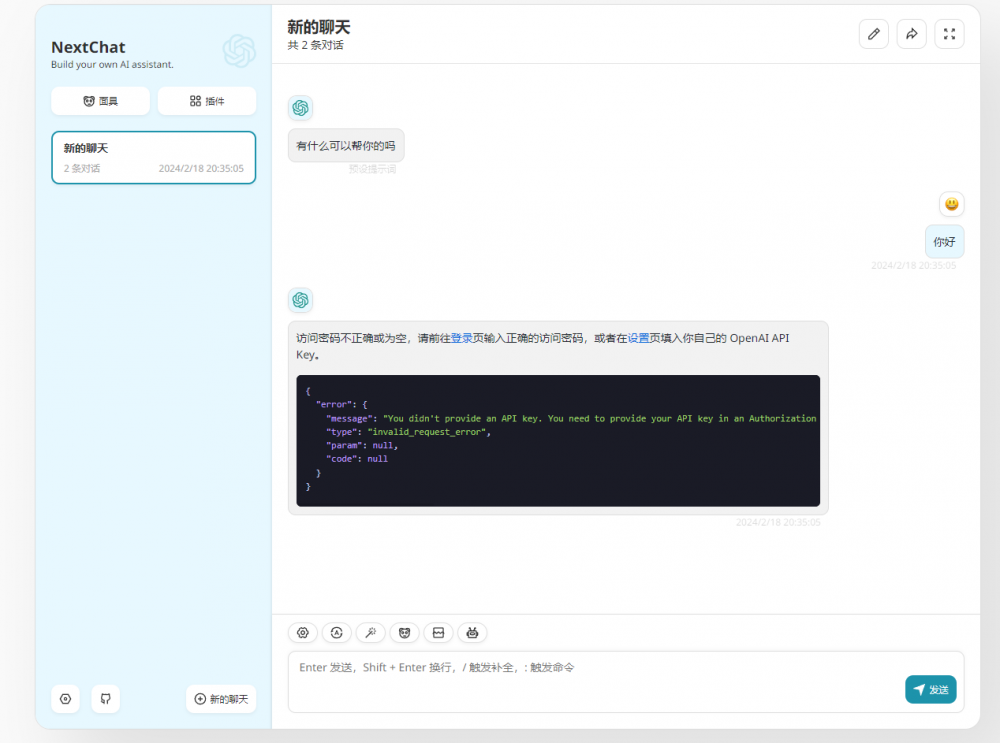 7、搭建ChatGPT現在已經完成了,訪問:http://你的公網IP:3000 就可以看到已經出現了ChatGPT的界面,但是發送內容會提示輸入密碼或設置OpenAI API key